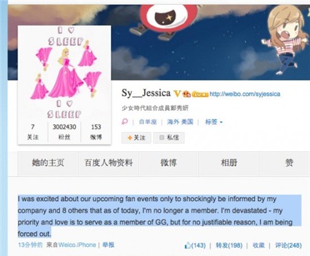 Jessica viết: "Tôi đã rất phấn khích về các hoạt động sắp tới cùng fan thì sửng sốt vô cùng khi được công ty và 8 thành viên khác thông báo kể từ ngày hôm nay, tôi không còn là một thành viên của SNSD. Tôi đang bị khủng hoảng. Ưu tiên và tình yêu của tôi đó là được hoạt động như là một thành viên của SNSD, nhưng không có lý do chính đáng, tôi bị buộc phải rời nhóm".
