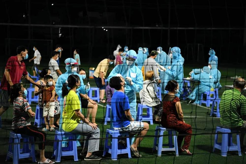 Hơn 0 giờ đêm, người dân xếp hàng, đảm bảo khoảng cách và chờ đợi, hợp tác cùng lực lượng y tế để truy vết mầm bệnh trong cộng đồng. Ảnh: Lan Chi