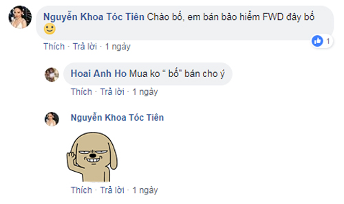 Ngay lập tức, trong phần bình luận, nữ ca sĩ nóng bỏng Tóc Tiên đã “chào bán bảo hiểm FWD” một cách đầy thú vị. Hồ Hoài Anh cũng hóm hỉnh trả lời như một salesman “chuyên nghiệp”..