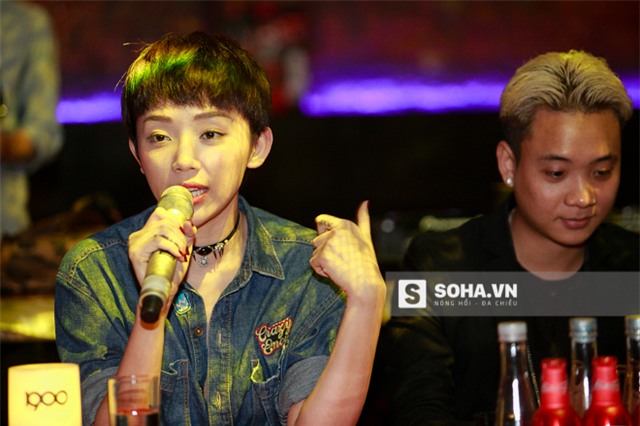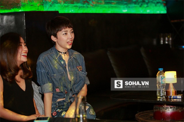 Lát sau, Justa Tee cùng một số nghệ sĩ khác tới tham dự họp báo. Tóc Tiên vui vẻ chào và trò chuyện cùng mọi người.