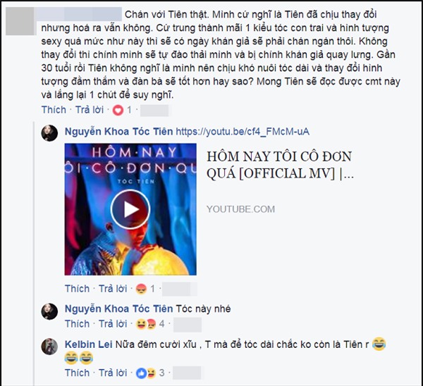 Trước lời khuyên của khán giả này, Tóc Tiên trả lời bằng bình luận "Tóc này nhé" đi kèm với tạo hình đầu trọc của cô trong một MV. Lối đáp trả hài hước của nữ ca sĩ khiến nhiều người hâm mộ phải bật cười. "Tiên mà để tóc dài chắc không còn là Tiên rồi", stylist Keibin Lei cũng nhập cuộc trước sự hài hước của đàn chị.