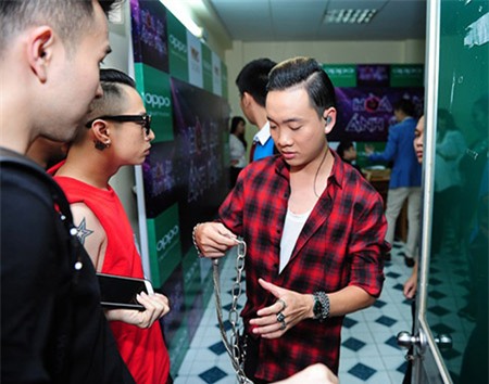 Justa Tee là một trong những khách mời biểu diễn ở đêm công bố trao giải. Anh chuẩn bị phụ kiện cẩn thận trước giờ diễn. |