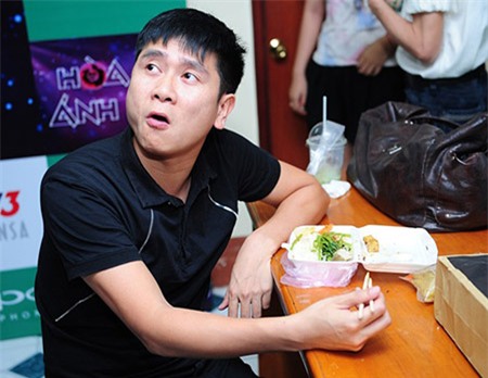Giám đốc âm nhạc Hồ Hoài Anh tranh thủ ăn lót dạ trong khu vực hậu trường. |