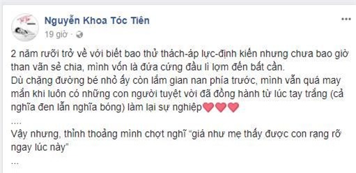 Với những thành công mà nữ ca sĩ đang có, Tóc Tiên chỉ ước “giá như mẹ thấy được con rạng rỡ ngay lúc này”.