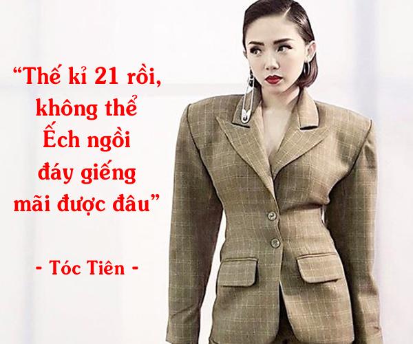“Em, tiền chị làm sản phẩm cũng từ tiền túi mà ra chứ chả ngủ với ông nào để khoác lên cái hào nhoáng trên người cả! 15 năm đi hát chị chưa từng 'trả giá' bất cứ điều gì nên chị có quyền tự tin và tự hào về bản thân! Còn về chuyện cá nhân của mỗi người, chị không kể ra thì không có nghĩa là Tóc Tiên chỉ toàn vui tươi tưng tửng.