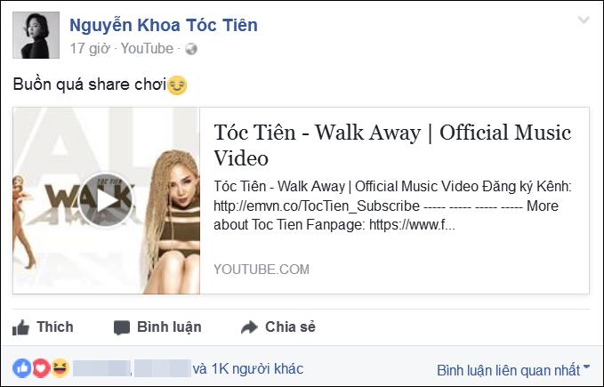 Câu chuyện bắt đầu từ việc Tóc Tiên chia sẻ MV lên trang cá nhân.