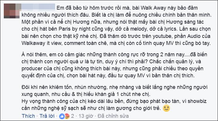 Theo đó, một khán giả bất ngờ để lại dòng bình luận khá dài trên Facebook Tóc Tiên, cho rằng MV Walk Away không thành công vì nữ ca sĩ làm là để nuông chiều bản thân mình. Người này cho rằng chính thành công trong hai năm qua đã biến huấn luyện viên của Giọng hát Việt 2017 trở thành người quá tự tin.