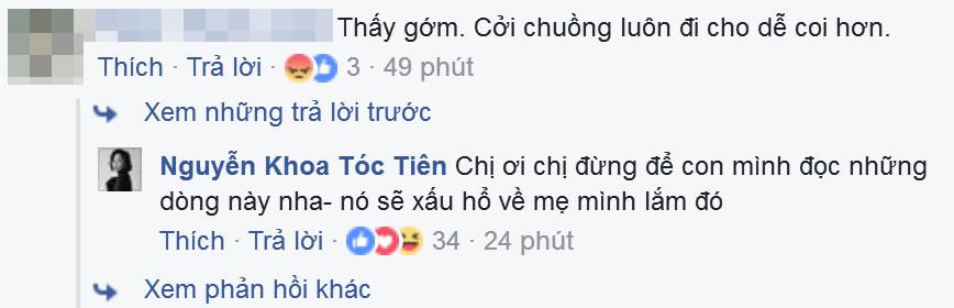 Cách đây ít lâu, khi khoe ảnh tạo dáng với bikini trên đất Thái Lan, Tóc Tiên cũng bị một anti-fan chỉ trích ăn mặc phản cảm. "Chị đừng để con mình đọc được những dòng này nha. Nó sẽ xấu hổ về mẹ mình lắm đó", nữ ca sĩ phản pháo rất mạnh mẽ.