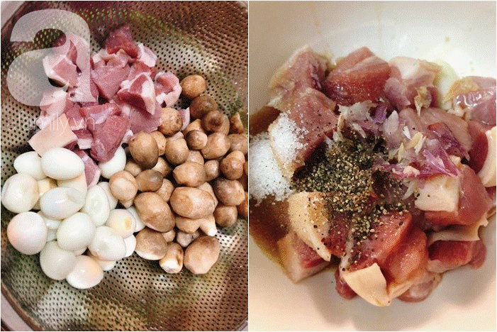 Các nguyên liệu sơ chế sạch. Thịt heo ướp với gia vị để 30 phút cho thấm.