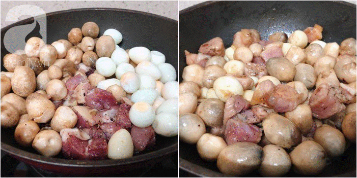 Làm nóng chảo, cho dầu ăn cùng một muỗng đường nấu đến khi đường chuyển màu cánh gián để tạo màu kho. Cho thịt đã ướp, nấm rơm, trứng cút vào đảo đều. Đậy nắp lại nấu thêm 10 phút.