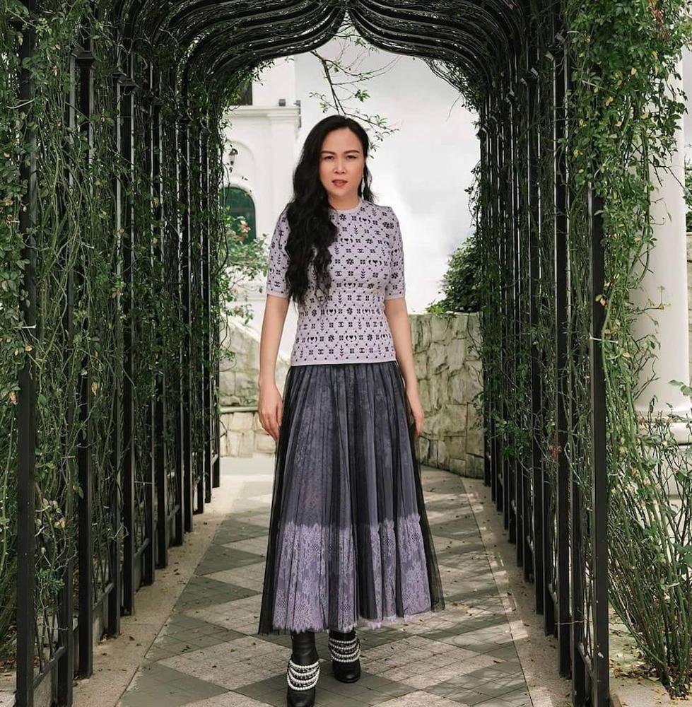 Không hiểu vì sao, "người tình Quách Ngọc Ngoan" rất có thù với các kiểu váy dài tha thướt, lòa xòa, mặc dù xét về tổng thể vóc dáng, kiểu đồ này chẳng hề mang đến sự nữ tính, nhẹ nhàng như cô kì vọng, mà trái lại càng "dìm hàng" nữ doanh nhân thêm mấy phần, trông luộm thuộm, thấp bé hẳn.