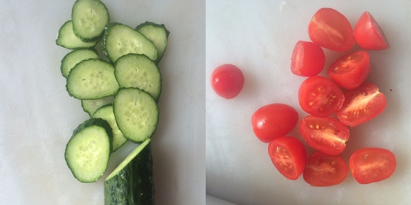 Dưa chuột rửa sạch thái lát. Cà chua bi rửa sạch bổ đôi.