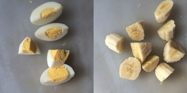 Trứng bóc bỏ vỏ, thái miếng dạng múi cau. Chuối bóc bỏ vỏ thái lát hoặc thái khối. Để đa dạng protein cho món ăn trong chuỗi ngày giảm cân bạn có thể thay thế trứng bằng các loại thực phẩm khác như: ức gà, cá hồi, tôm, thịt bò...