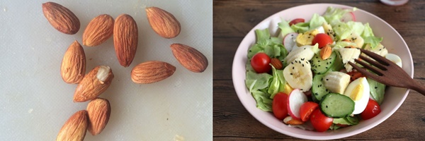 Hạnh nhân nghiền hoặc giã dập. Cho rau xà lách, củ cải, dưa chuột, chuối, trứng, hạnh nhân, vừng rang chín vào đĩa, thêm xốt salad vào trộn đều là xong.