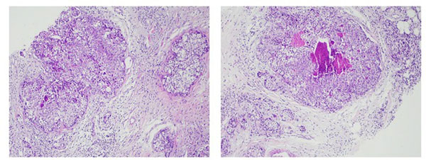 Bệnh nhân đã được tư vấn sinh thiết tuyến vú hai bên và chọc xét nghiệm tế bào hạch nách trái, kết quả giải phẫu bệnh cho thấy hình ảnh ung thư tuyến vú trái - hạch di căn vùng nách trái và quá sản tuyến vú phải.