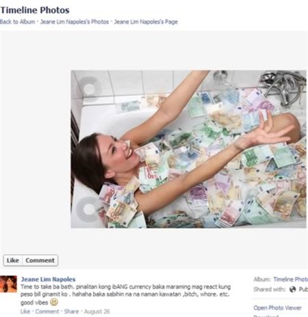 Jeane thường xuyên khoe sự giàu sang, cuộc sống xa hoa của mình bằng những bức ảnh chụp hàng hiệu, xe xịn, nhưng gây sốc nhất vẫn là bức ảnh tắm trong bồn đầy tiền. Hành động khoe mẽ của Jeane đã khiến cô bị điều tra bởi Cục thuế Philippines vì nghi ngờ trốn thuế. Ngoài ra, mẹ của Jeane, bà Janet Napoles, một doanh nhân cũng đang bị điều tra bởi cáo buộc liên quan đến một vụ biển thủ số tiền lên tới hơn 232.000 đô la (khoảng 4,87 tỷ đồng) từ ngân sách chính phủ.