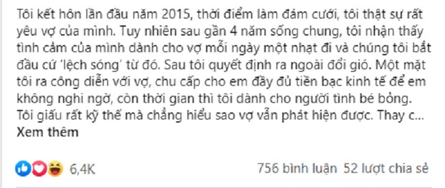 Chuyện của anh như sau: "Tôi kết hôn lần đầu năm 2015, thời điểm làm đám cưới, tôi thật sự rất yêu vợ của mình. Tuy nhiên sau gần 4 năm sống chung, tôi nhận thấy tình cảm của mình dành cho vợ mỗi ngày một nhạt đi và chúng tôi bắt đầu cứ 'lệch sóng' từ đó. Sau tôi quyết định ra ngoài đổi gió. Một mặt tôi ra công diễn với vợ, chu cấp cho em đầy đủ tiền bạc kinh tế để em không nghi ngờ, còn thời gian thì tôi dành cho người tình bé bỏng.