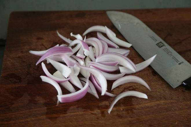 Chiên tôm cho đến khi tôm chín tới, chuyển sang màu hồng đỏ rồi cho hành tây vào, xào vài lần rồi cho ra đĩa.