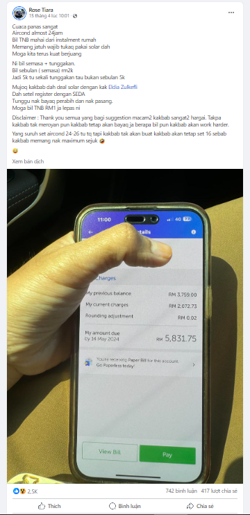 Theo thông tin trên tờ World Of Buzz, mới đây, người phụ nữ tên Rose Tiara đã đăng tải bài viết trên trang cá nhân cho thấy cô đã sốc thé nào khi nhìn thấy hóa đơn tiền điện của tháng 4 là 2.072 Ringgit (đơn vị tiền tệ của Malaysia, tương đương khoảng 11 triệu VNĐ). Rose cho biết đây cũng là số tiền nhiều nhất từ trước tới nay mà cô từng phải trả. Lần nhiều thứ nhì chỉ là 1600 Ringgit (tương đương 8,5 triệu VNĐ).