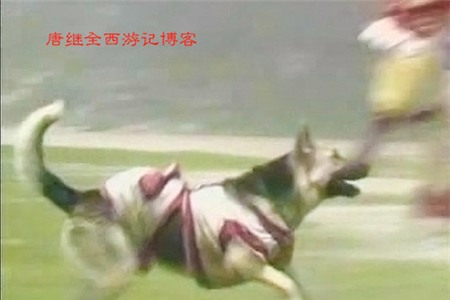 Lần thứ hai là cảnh Hao thiên khuyển đuổi theo Tôn Ngộ Không, sau đó Tôn Ngộ Không biến thành ngôi miếu cổ. Lục Tiểu Linh Đồng được treo trên dây cáp diễn cảnh bay, trong khi đó ở bên dưới chú khuyển cảnh ra sức truy đuổi. Khi tập thì mọi thứ đều đúng như yêu cầu, tuy nhiên đến lúc diễn thật lại xảy ra sự cố. Theo quy định, sau một đoạn bay, nhận lệnh của đạo diễn, Lục Tiểu Linh Đồng được nhân viên phụ trách kéo dây cho hạ xuống. Song, do chủ nhân của chú chó chạy không kịp, tạo một khoảng cách khá xa nên chú chó không nhận được lệnh dừng, cứ tiếp tục lao tới vào chồm lên người Tôn Ngộ Không. May thay, Lục Tiểu Linh Đồng kịp thời co hai chân lên bảo vệ và người chủ cũng hét to đúng lúc nên chú chó chỉ cắn trúng quần ông.