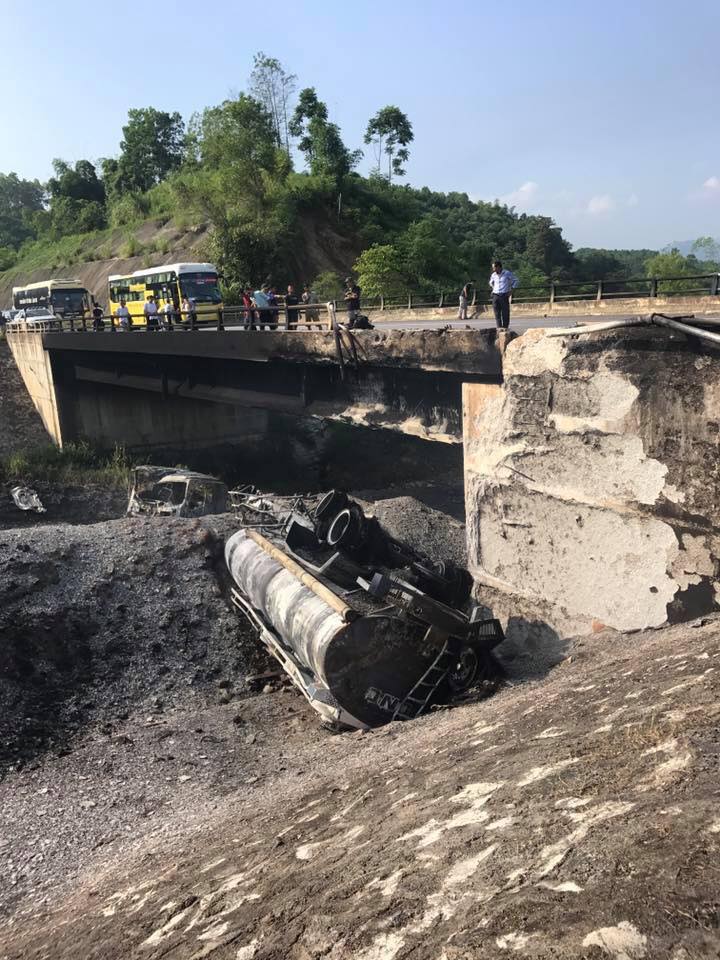 Xe tải đâm vào đuôi xe con đi phía trước rồi lộn xuống chân cầu, nổ tung như bom trước khi bốc cháy.