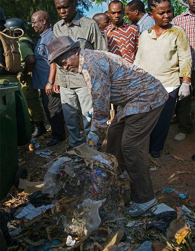 Tổng thống Magufuli tự tay nhặt rác bỏ vào thùng. Ảnh: BBC |