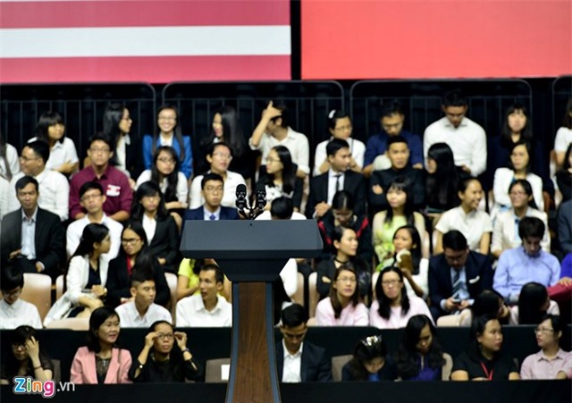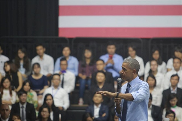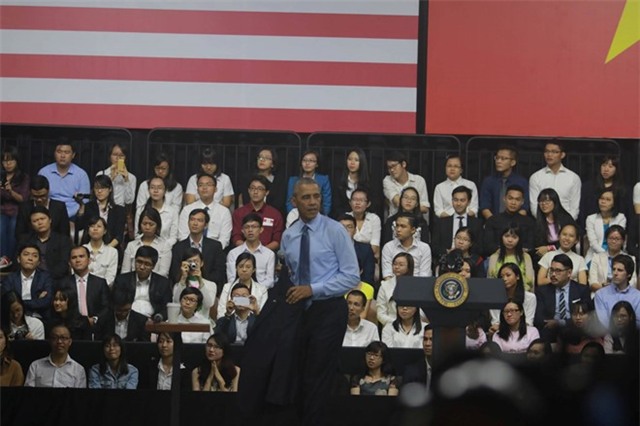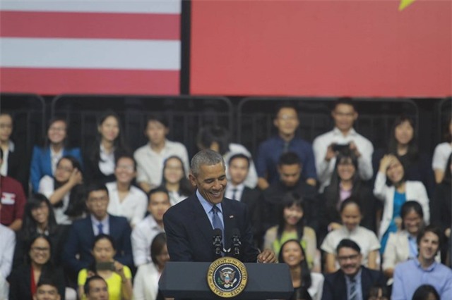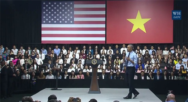 Tổng thống Obama tiếp lời: Cần nhớ rằng ở Việt Nam, 2/3 người dân sinh sau năm 1975. Các bạn nhìn ra thế giới với sự tươi sáng, không bị tư duy kiểu cũ. Các bạn có nhận thức, năng lực để không chỉ phát triển Việt Nam, mà còn định hình thế giới. Các bạn có công nghệ để kết nối.