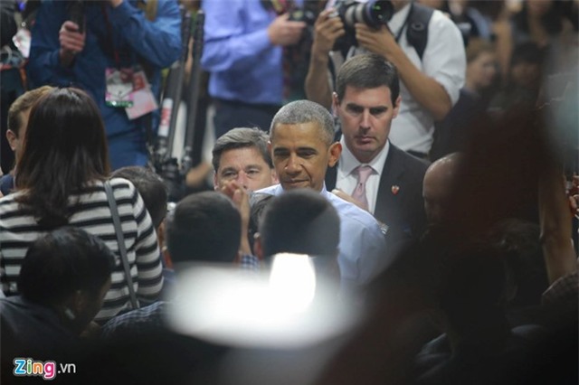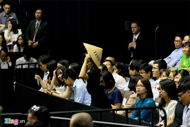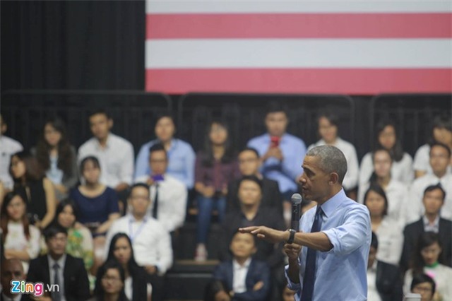 Ngay sau đó, Tổng thống Obama dành thời gian hỏi đáp với các bạn trẻ Việt. "Các bạn hãy hỏi ngắn, chúng ta sẽ có nhiều thời gian", ông nói.