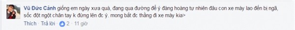 “Giống em ngày xưa quá, đang qua đường để ý đàng hoàng tự nhiên đâu con xe máy lao đâm vào người, sốc đột ngột nên không đứng lên được. Mong bắt được thằng đi xe máy kia” - tài khoản K.M bình luận.