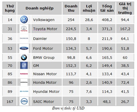 Dưới đây là thứ hạng của 10 nhà sản xuất ô tô lớn nhất thế giới năm 2013 trong bảng xếp hạng Global 2000: