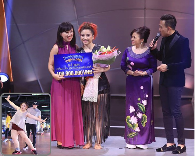Đại diện nhãn hàng LIC trao giải Giảm Cân An Toàn dành cho Huyền Thanh - thí sinh giảm cân đúng cách và an toàn, hiệu quả nhất. Ảnh nhỏ: Huyền Thanh trong một buổi tập khi mới tham gia chương trình