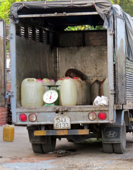 Cùng thời điểm, tổ trinh sát bám theo xe bồn khác đến đường Đào Trí, phường Phú Mỹ, quận 7. Tài xế xe này đang rút xăng cho vào 20 can nhựa thì bị phát hiện. Tại đây, nhiều đối tượng đi xe gắn máy mang theo can đến lấy xăng cũng bị tạm giữ.