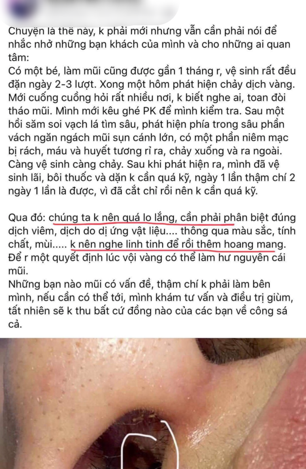 Đến ngày 1/5, bác sĩ nâng mũi cho T. lúc đầu lại phẫu thuật tháo vật liệu nhân tạo ra ngoài. T. phát hiện mũi mình bị co rút, mất vách ngăn, trụ mũi lủng lỗ, gồ ghề.