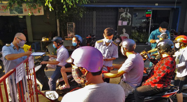 Các cơ quan chức năng bố trí lực lượng đông đảo cán bộ lấy thông tin từng người ra vào chợ dân sinh tại quận 7, TPHCM