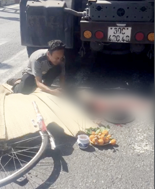 Vụ va chạm khiến cụ bà ngã ra đường, bị xe container cán tử vong tại chỗ, xe đạp cũng bị hư hỏng nằm bên cạnh.