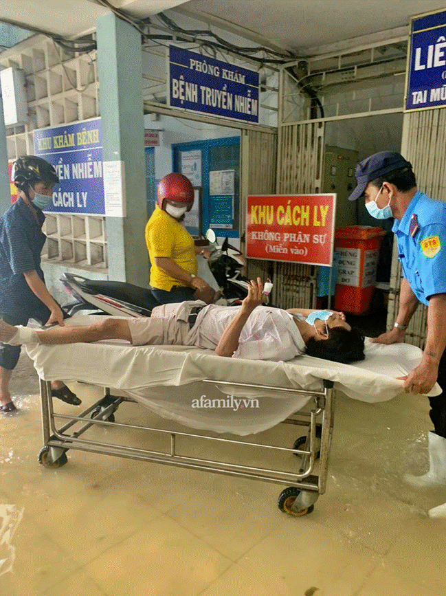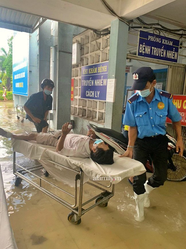 Bảo vệ lội nước đưa bệnh nhân vào nơi cấp cứu.
