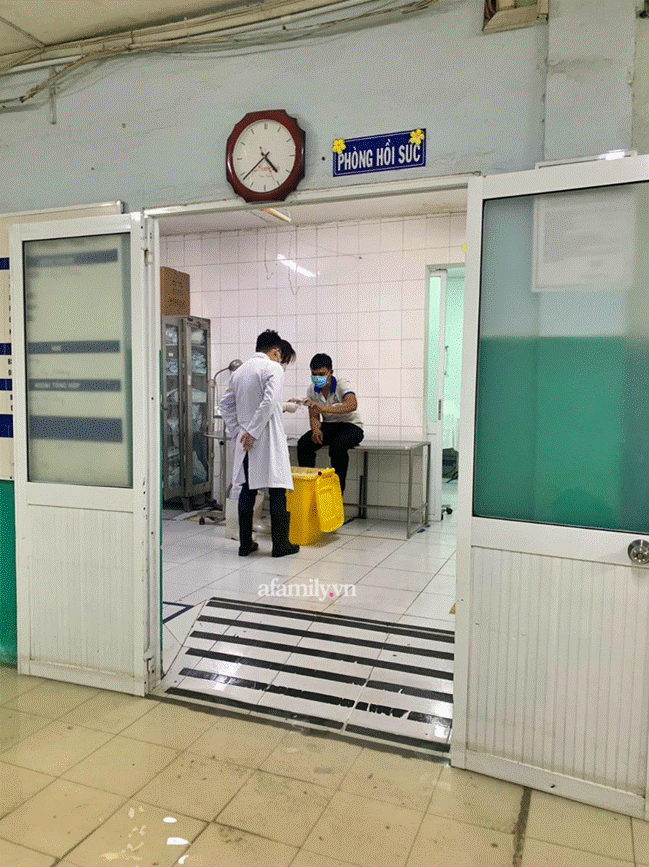 Vì mưa lớn nên các nhân viên y tế đã cho người dân dời vào trong khai báo y tế, đo nhiệt độ ngay trước cửa khoa Cấp cứu.