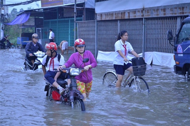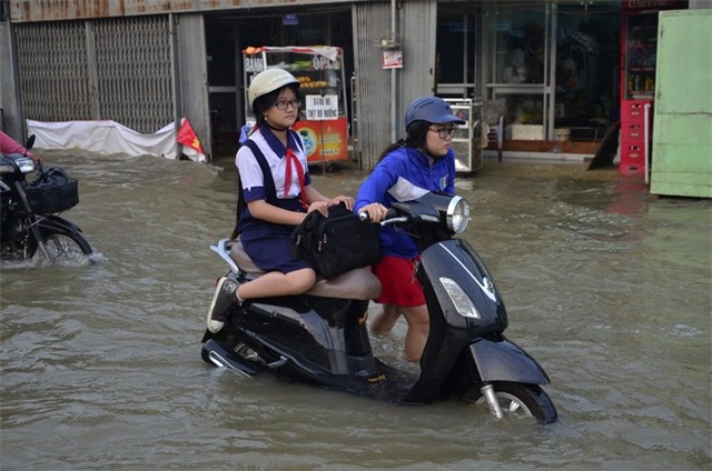 Nhiều em học sinh phải bì bõm lội nước đến trường và bị ướt hết trang phục, sách vở. Một số người vấp té ngã trên đường, ướt hết đồ đạc, hàng hóa.