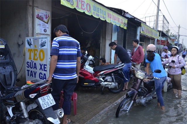 Thời điểm 5h sáng, triều cường chạm đỉnh 1,69m khiến các phương tiện lưu thông qua đây bị chết máy hàng loạt, người dân phải dắt bộ qua đoạn ngập khá xa nhưng do sáng sớm, các tiệm sửa xe vẫn chưa mở cửa khiến người dân phải chờ đợi rất lâu.