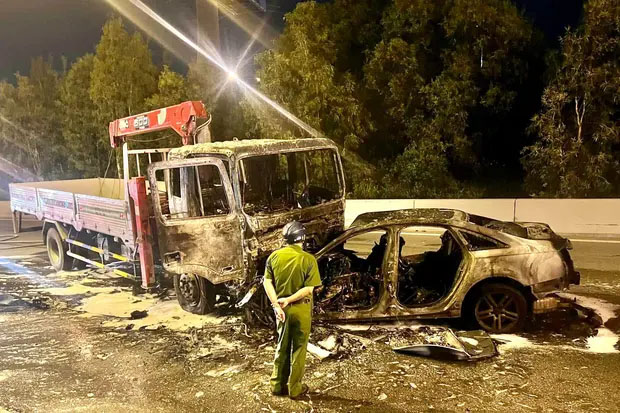 Vụ tai nạn khiến cả 2 phương tiện bốc cháy ngùn ngụt. Tài xế xe tải cẩu nhanh chóng mở cửa ra ngoài kịp thời nên may mắn thoát nạn. Trong khi đó 2 người ngồi trên ô tô 4 chỗ tử vong tại chỗ.