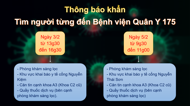 Liên quan đến ca nhiễm Covid-19 mới là nhân viên sân bay Tân Sơn Nhất, hiện đang cư ngụ tại TP. Thuận An, tỉnh Bình Dương. Quá trình điều tra dịch tễ cho thấy ngày 2 và 5/2, bệnh nhân có đến khám bệnh tại BV Quân y 175. Trung tâm Kiểm soát Bệnh tật TP.HCM thông báo khẩn đến người dân từng đến bệnh viện trên cần liên hệ ngay cơ sở y tế, cụ thể như sau: