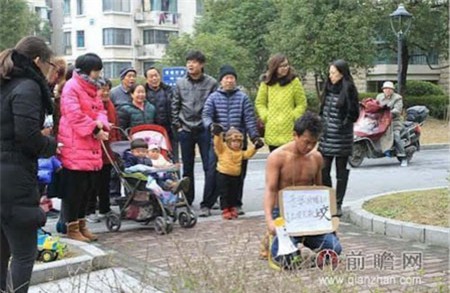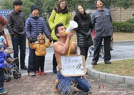 Anh Wang quỳ trước chung cư, nơi anh sống cùng vợ. Ảnh: Shanghaiist |