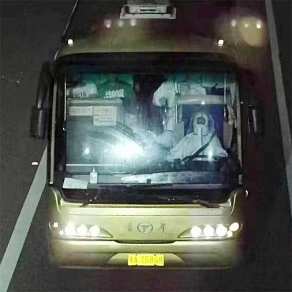 Tài xế mặc trang phục bảo hộ y tế chở người dân thành phố Qúy Dương đi cách ly tập trung vào ban đêm trước khi xảy ra tai nạn. (Ảnh: Weibo)