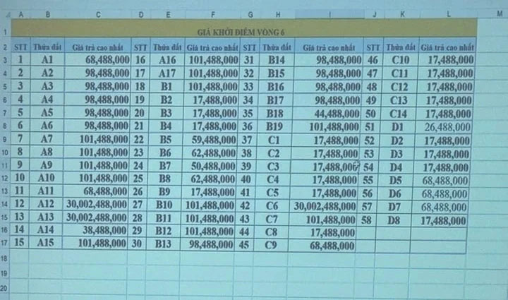 Sau cùng, chỉ có 22/58 lô đất được đấu trúng, mức giá dao động từ 32 - 50 triệu đồng/m2. Tất cả những người "hét" giá cao ở vòng 5 đều đã xin dừng trả giá ở vòng 6.
