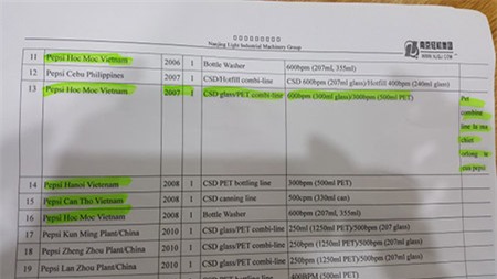 Theo đó, bảng giới thiệu bán hàng của công ty lắp máy Nanjing (Trung Quốc) có ghi rõ danh sách khách hàng của công ty này là Suntory Pepsico Việt Nam. Trong khi đó, Công ty Suntory Pepsico Việt Nam sử dụng máy móc của Nanjing trong nhiều nhà máy ở Hà Nội, Cần Thơ, TP. HCM, trong đó Pet Combine Line là máy chiết sản phẩm trà ô long Tea+ Plus.