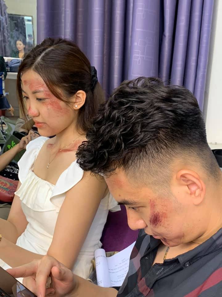 | Ngọc Quỳnh (vai Thái) đăng ảnh hậu trường cảnh phim Trà và người tình bị ăn đòn. |