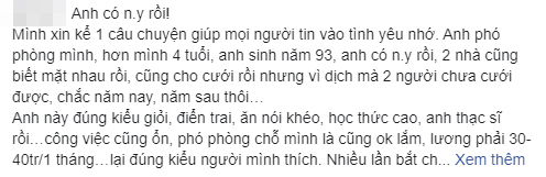 Mình xin kể 1 câu chuyện giúp mọi người tin vào tình yêu nhớ. Anh phó phòng mình, hơn mình 4 tuổi, anh sinh năm 93, anh có người yêu rồi, 2 nhà cũng biết mặt nhau rồi, cũng cho cưới rồi nhưng vì dịch mà 2 người chưa cưới được, chắc năm nay, năm sau thôi…