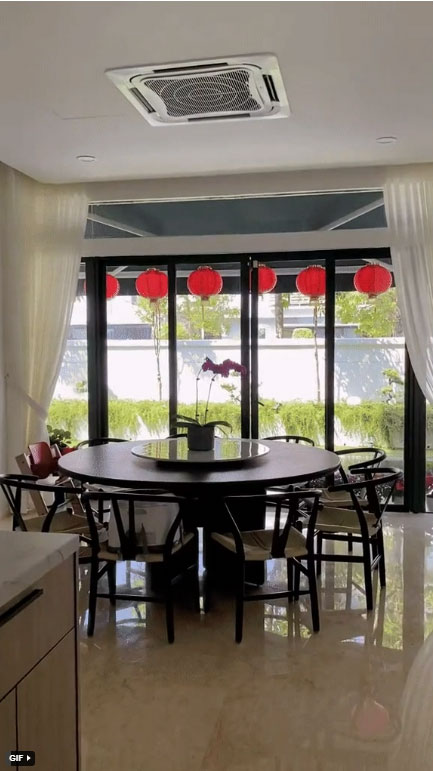 Bên cạnh phòng khách là khu bếp ăn nhìn thẳng ra bể bơi, tạo cảm giác thoáng đãng và mát mẻ. Khu vực này được trang trí theo kiểu người Hoa, có bàn tròn lớn và quay được để ăn nhiều món. Ngoài bếp trong nhà còn có bếp và khu vực rửa ngoài trời, rất rộng rãi nhưng Yuki không sử dụng bếp bao giờ mà tất cả đều do chị giúp việc, chồng và mẹ chồng nấu.