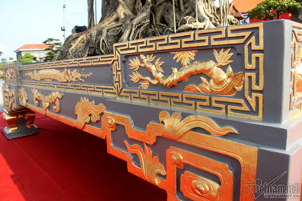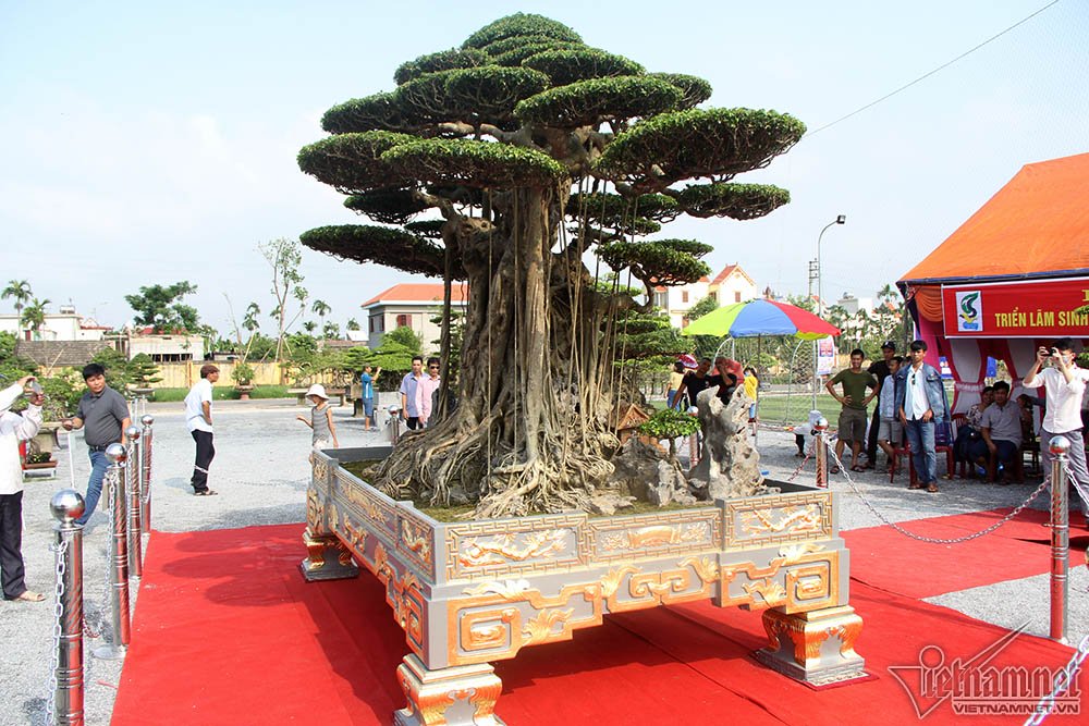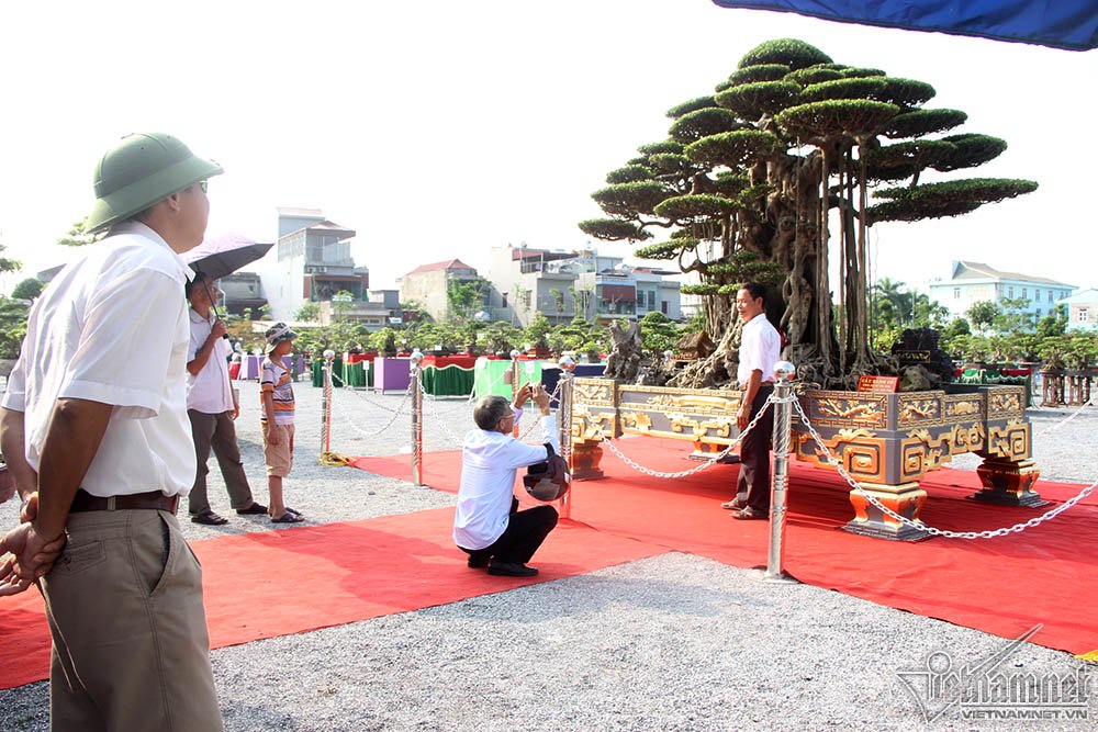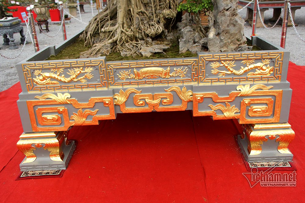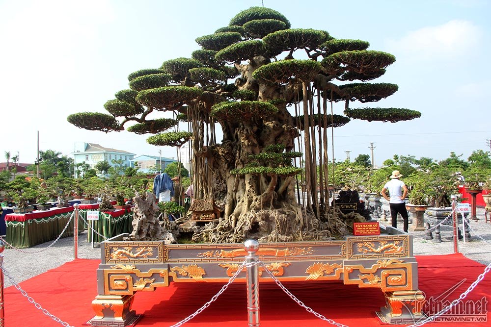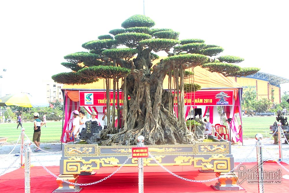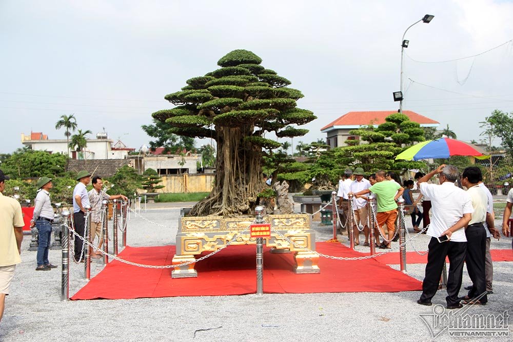 Siêu cây sanh "Đại thế vân tùng" trong chậu dát 5 cây vàng đặt trang trọng trên thảm đỏ, được căng dây bảo vệ ngày đêm.