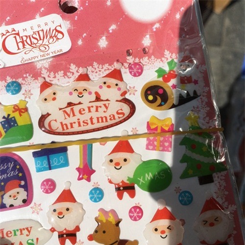 Một quán hàng bán đồ chơi trẻ em ngay cạnh trường tiểu học Đặng Trần Côn, Nguyễn Quý Đức, (Thanh Xuân, Hà Nội) có bán đầy đủ những mặt hàng dành cho trẻ nhỏ. Miếng dán sticker có hình Noel có loại phủ nhựa, loại phủ keo với giá khác nhau.